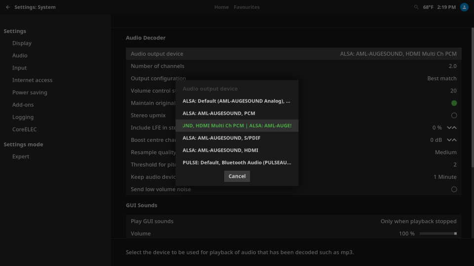On the System settings menu, scroll down to “Audio”, then choose “Audio output device” in the main panel and click “OK.” A dialog box will appear with the various audio outputs available. Choose the one that you need. Click the back arrow (looks like U turn) to exit this menu when done.
