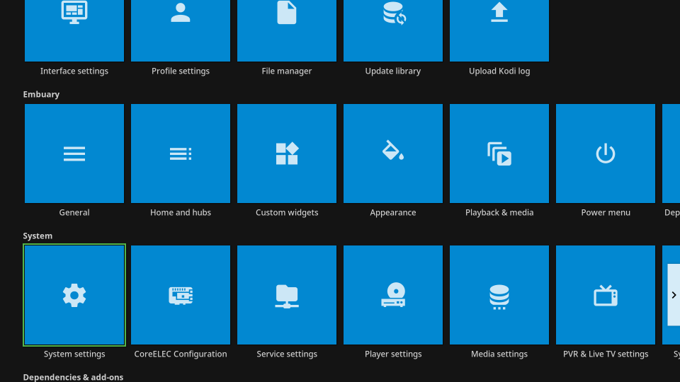 To chose the audio output for your CoreBOX (HDMI, S/PDIF), you access the setting in the XMBC media center of your CoreBOX as follows.