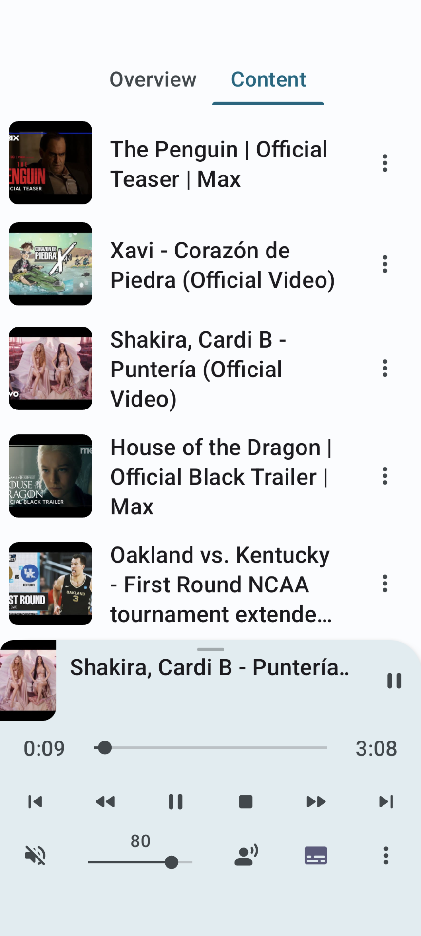 - Now playing screen allows skipping, seeking, stop and pause