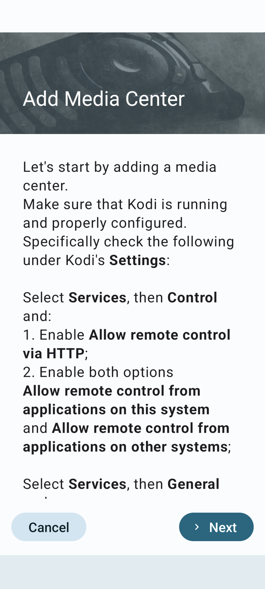 Download and install the app for your device using the links at the top of this article, then run the app. You’ll be prompted to connect a media center to your remote. The instructions shown on this page are the ones you’ve already completed, so tap “Next.”