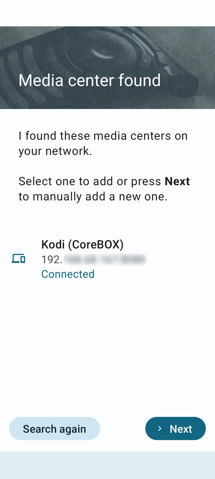 The Kore remote app will scan for the CoreBOX on your local network and display what it finds. Repeat the scan if the remote app does not find your CoreBOX on the first try. If the CoreBOX is not found after 2-3 attempts, verify that it’s still connected to your home network, and double-check the configuration described in the first section.
