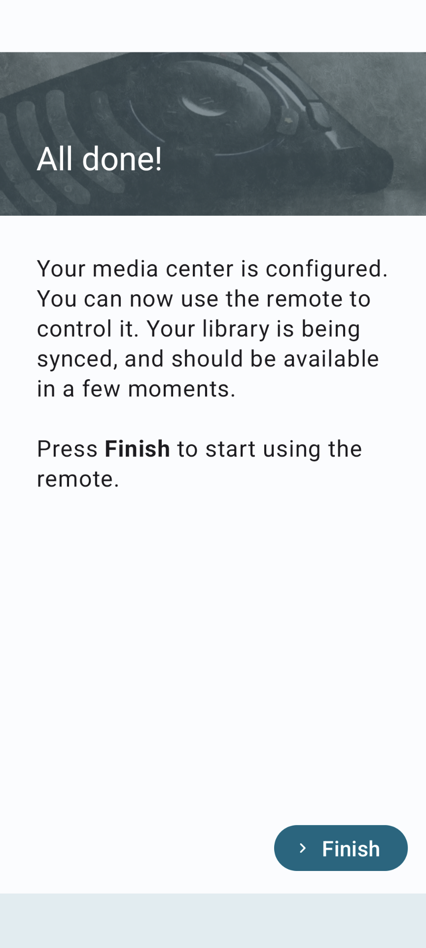 If the test is successful, the Kore remote app will connect to your CoreBOX and display the “All done!” screen below. You can then tap “Finish to begin using the remote.