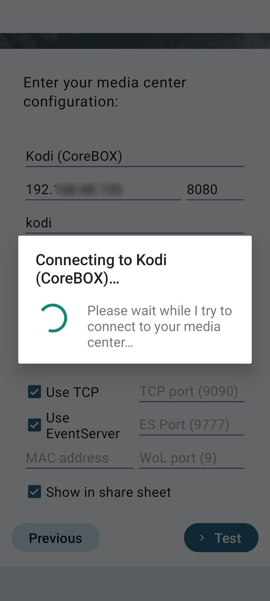 You’ll be prompted to enter the username and password you set up in the first section. Provide those in the supplied fields, and leave the rest of the settings at their default values. Tap “Test” to verify connectivity to your CoreBOX.