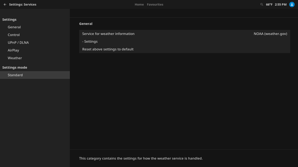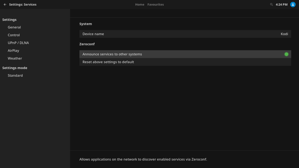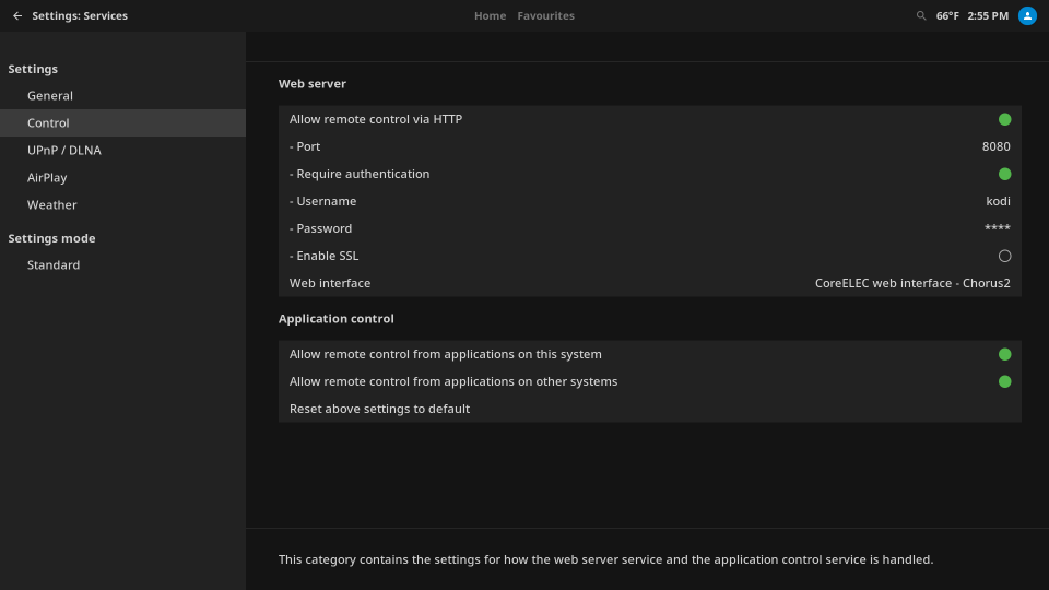 Note: XMBC/Kodi’s settings have various display modes: Basic, Standard, Advanced, and Expert. You must be using Standard mode or higher to perform the next step. To verify this, look at the bottom of the left-hand panel where it says “Settings mode.” If the mode is currently set to “Basic,” click on it until it displays “Standard” or higher.