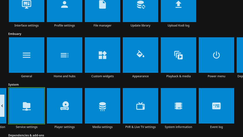 Scroll down to the system group, then highlight “Service settings.” Click “OK.”